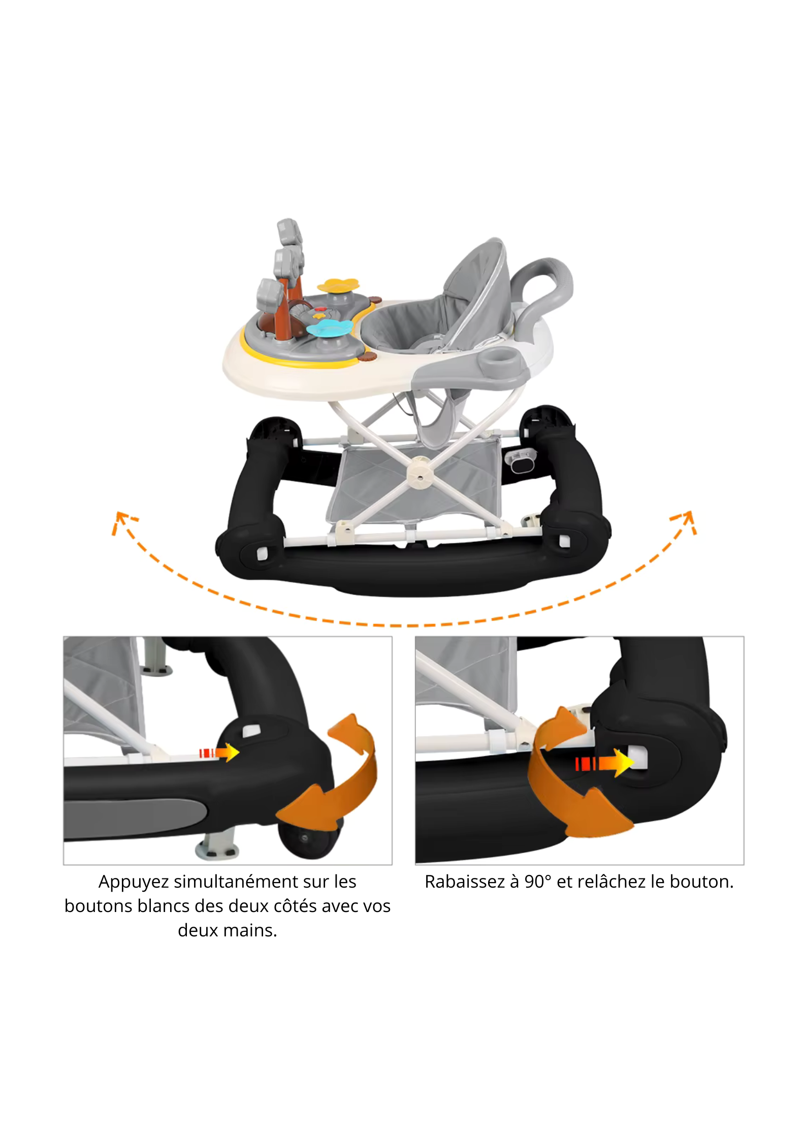 Conçu pour offrir stabilité, confort et plaisir, il se transforme en quelques secondes en un cheval à bascule, permettant à l’enfant de passer de la marche au balancement en toute simplicité.